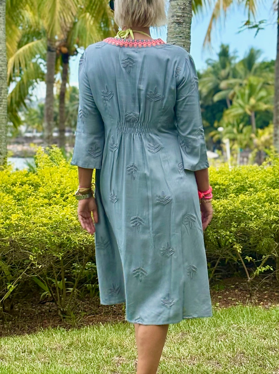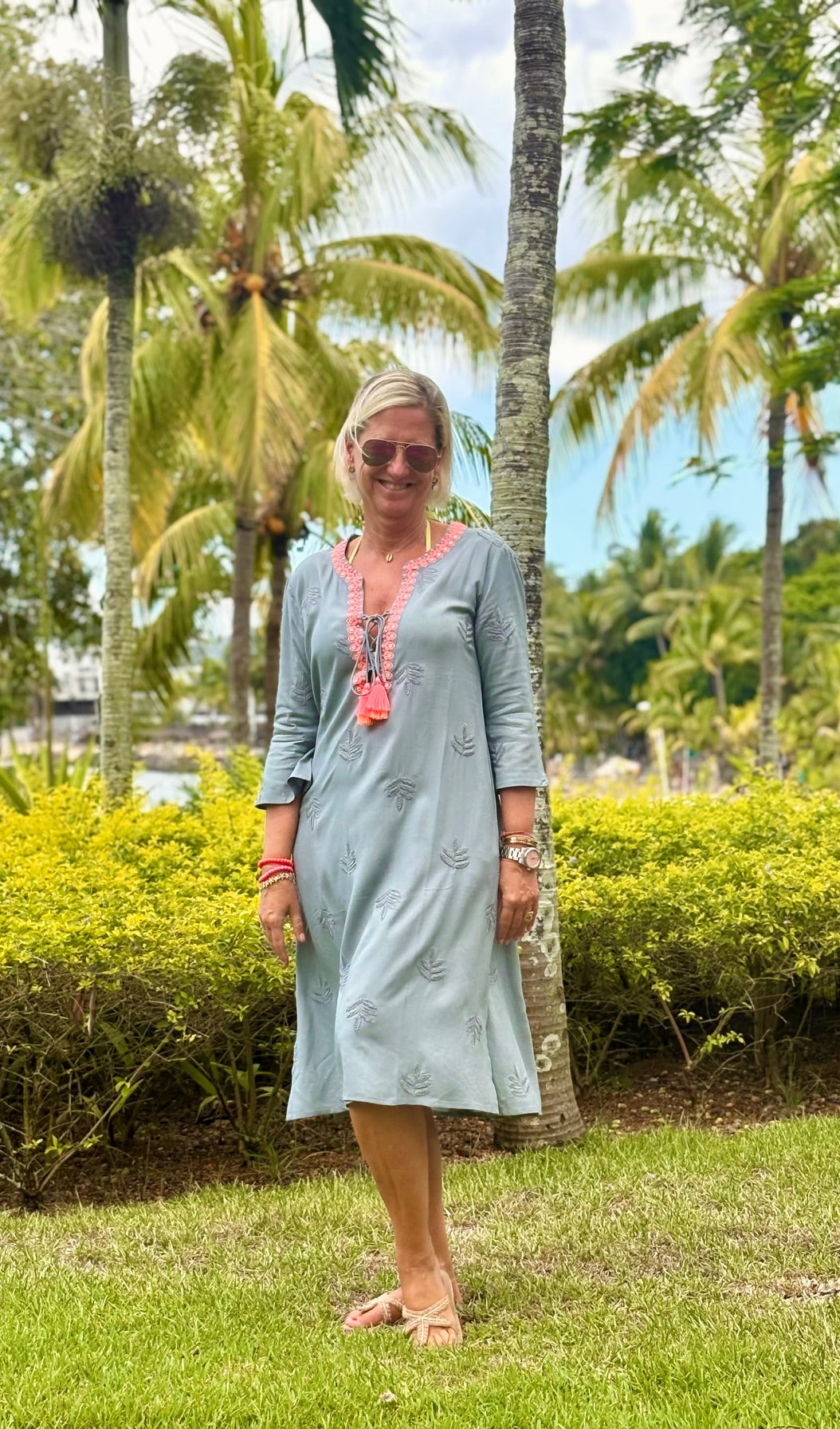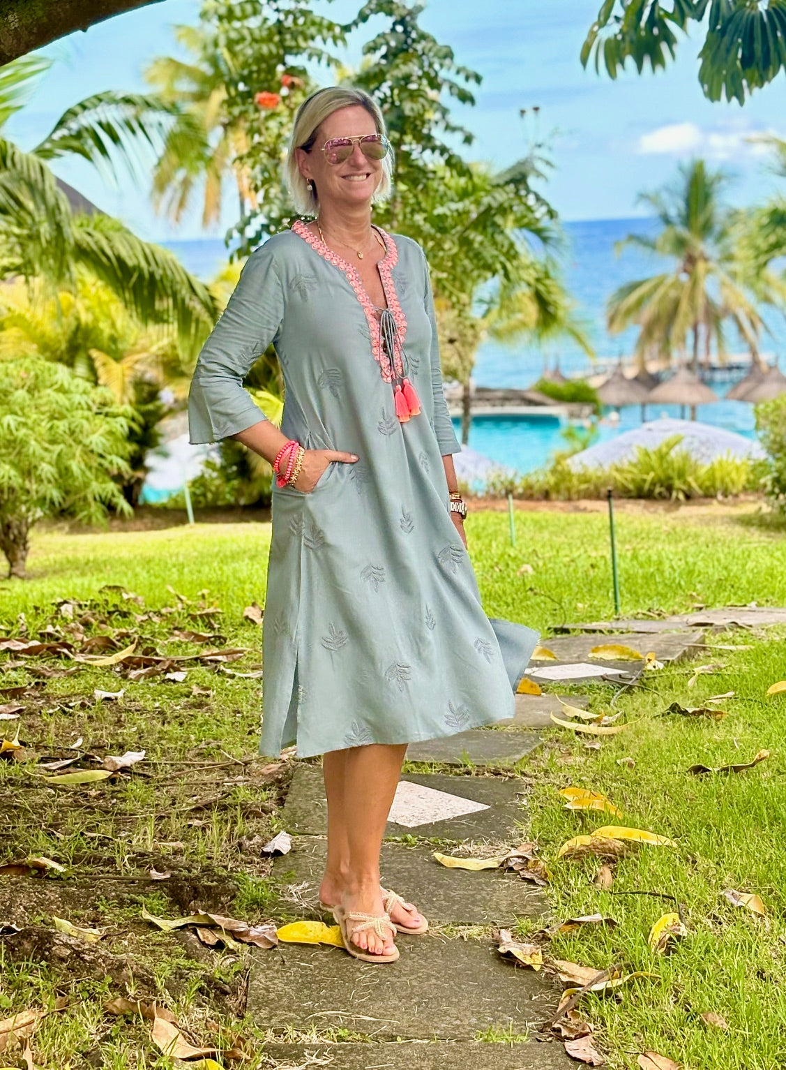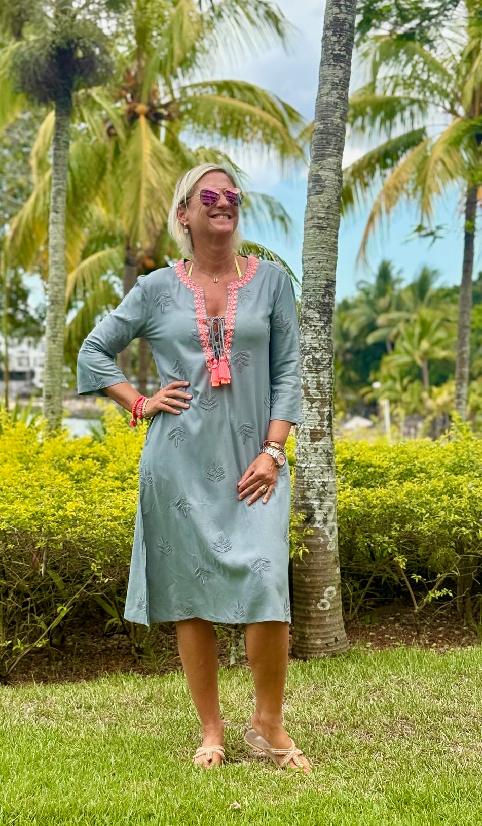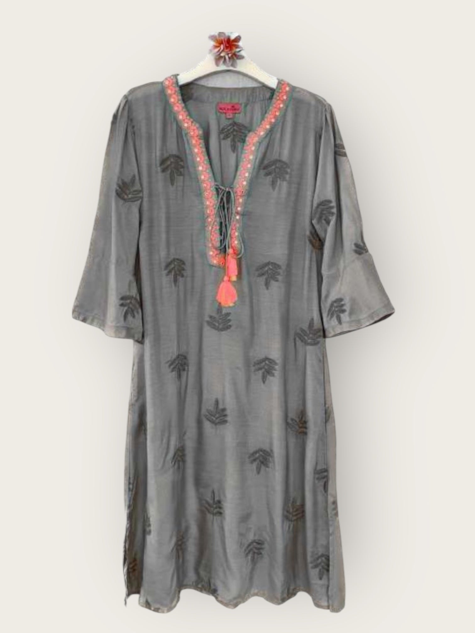 Willkommen in der farbenfrohen Welt des Gloria Dress in Kurz von Bee Daisy! Dieses Tunika Dress vereint Unbeschwertheit und Stil an einem Ort, und das alles mit einem Hauch von Eleganz. Die leuchtende neon coralfarbene Einfassung setzt die dekorative Blätterbestickung effektvoll in Szene, sodass Du bei jedem Anlass strahlst.