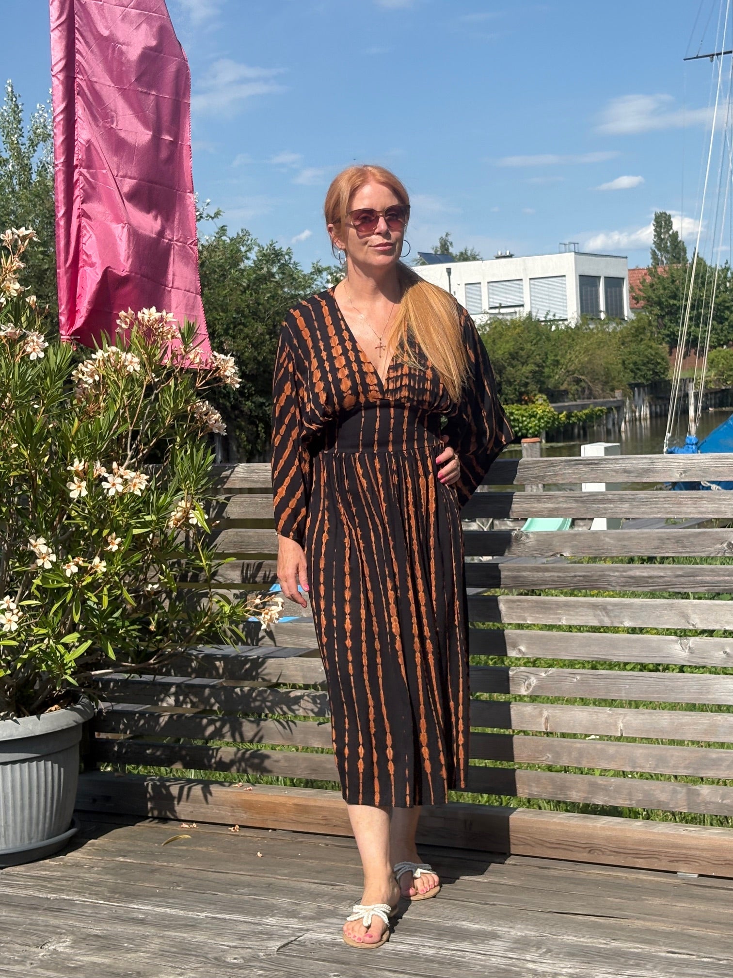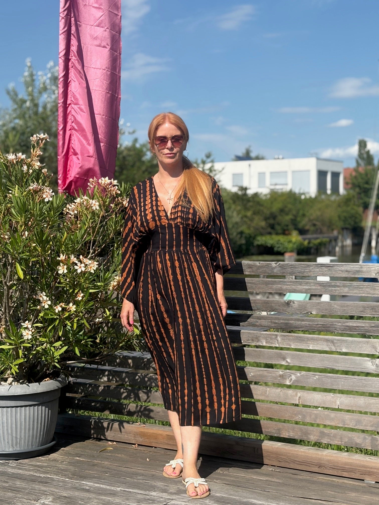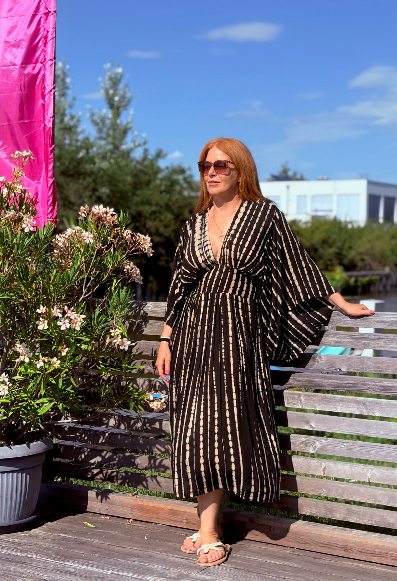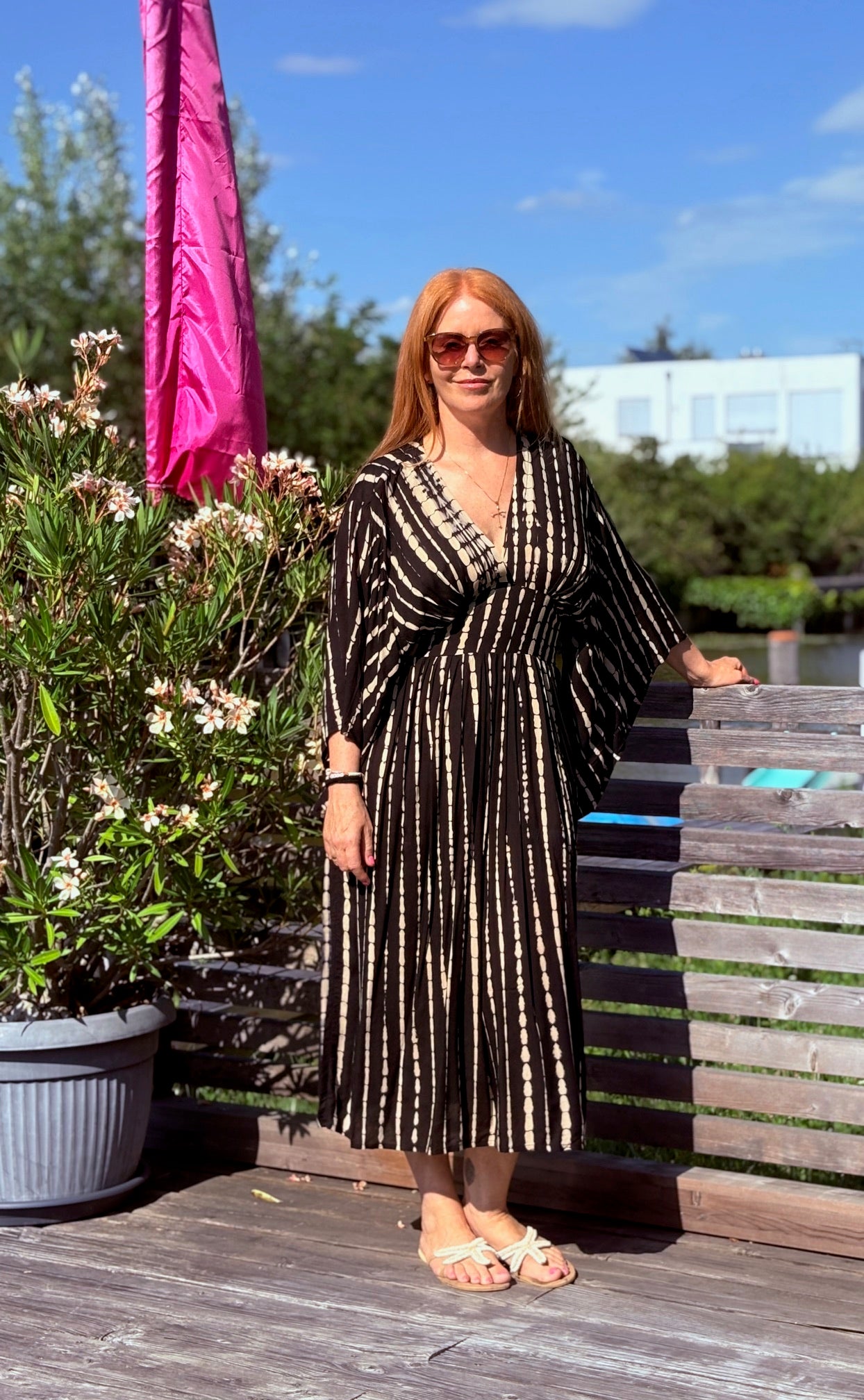 Entdecke das Kaftan Dress Midi "Alessia", ein absolutes Must-Have für deinen nächsten Strandurlaub! Sein luftiger, lockerer Schnitt sorgt für maximalen Komfort und Bewegungsfreiheit, während der schmale hohe Taillenbund deiner Silhouette schmeichelt. Der tiefe V-Ausschnitt und die weiten offenen Ärmel verleihen dem Kleid einen aufregenden, lässigen Look, der perfekt für entspannte Sommertage geeignet ist.