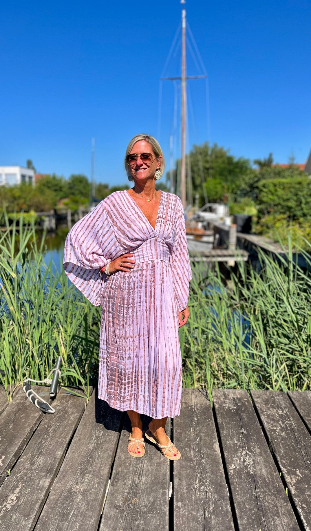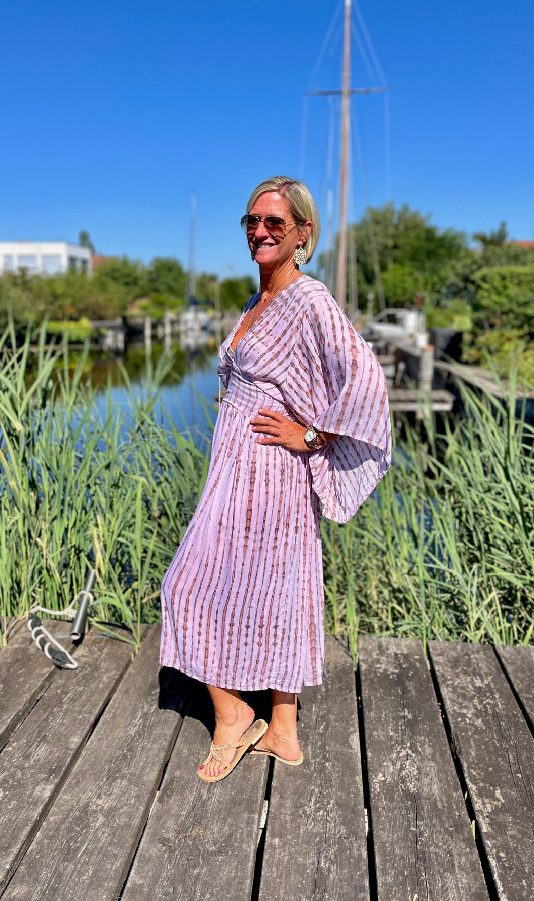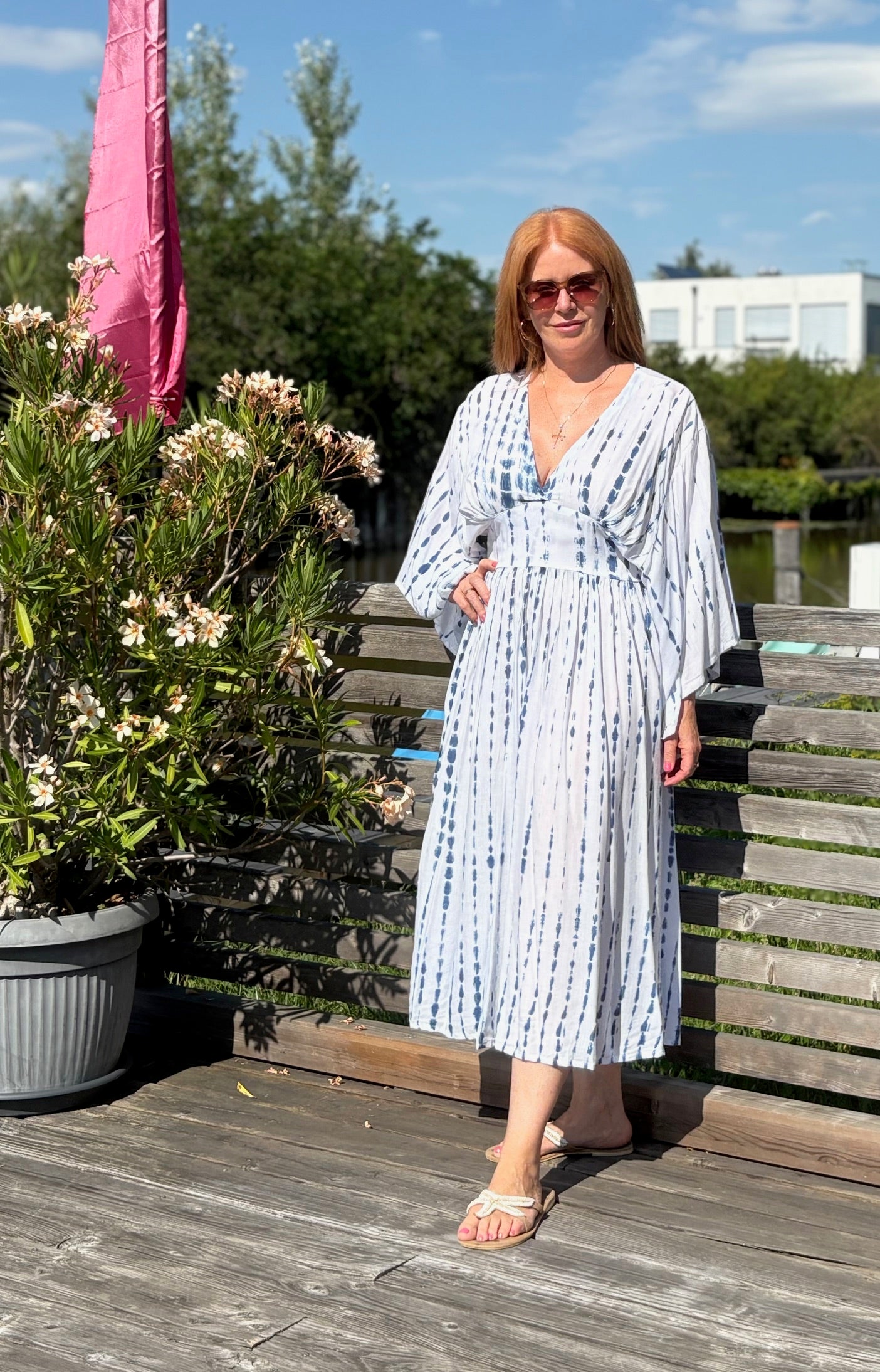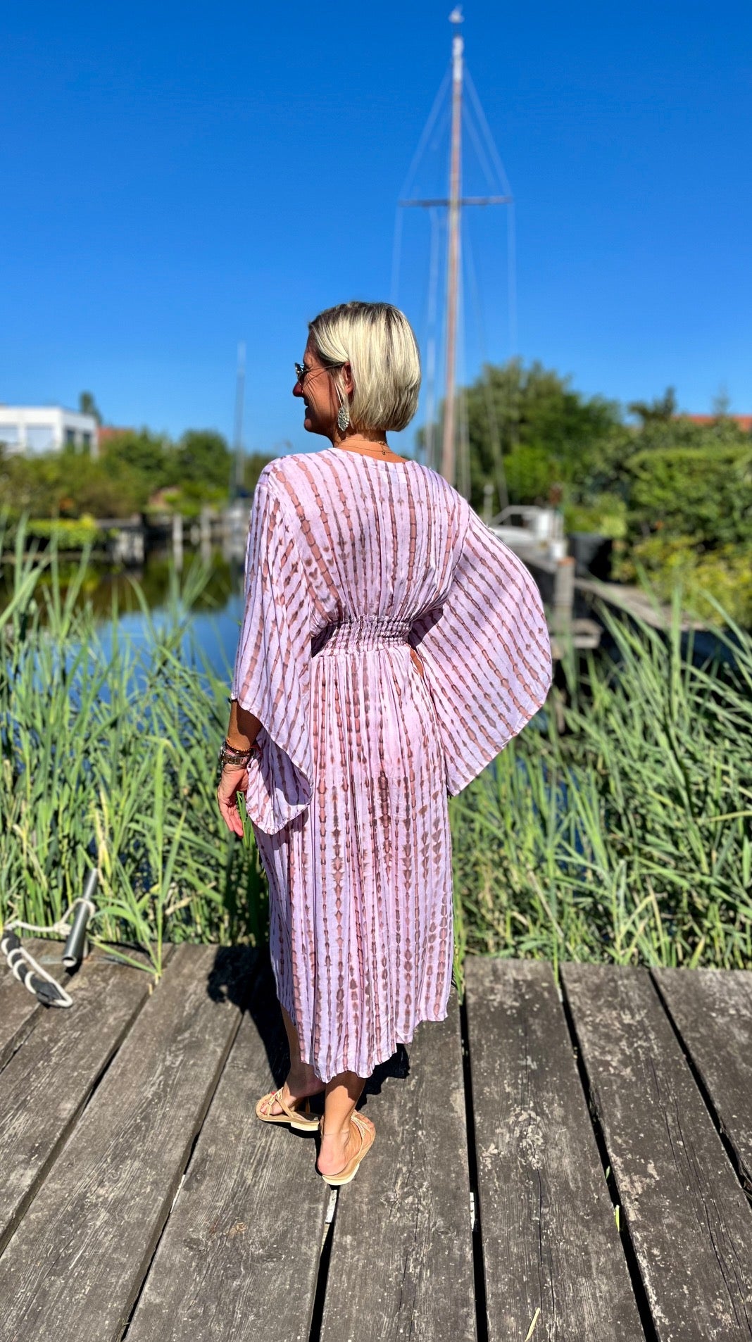 Dieses vielseitige Kaftan Kleid ist ein echter Hingucker und lässt sich mühelos zu verschiedenen Anlässen stylen. Kombiniere es mit deinen Lieblingssandalen und einer großen Sonnenbrille für einen perfekten Beach-Look, oder trage es mit eleganten Accessoires und Wedges für ein Dinner am Meer. Mit dem Alessia Dress bist du immer im Mittelpunkt des Geschehens und genießt dabei unvergleichlichen Komfort.
