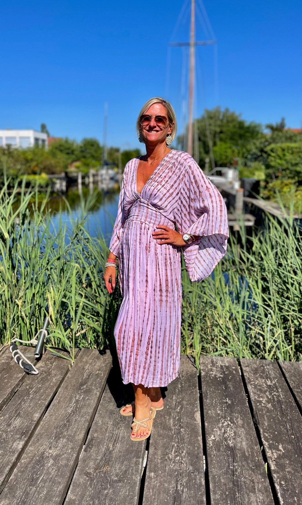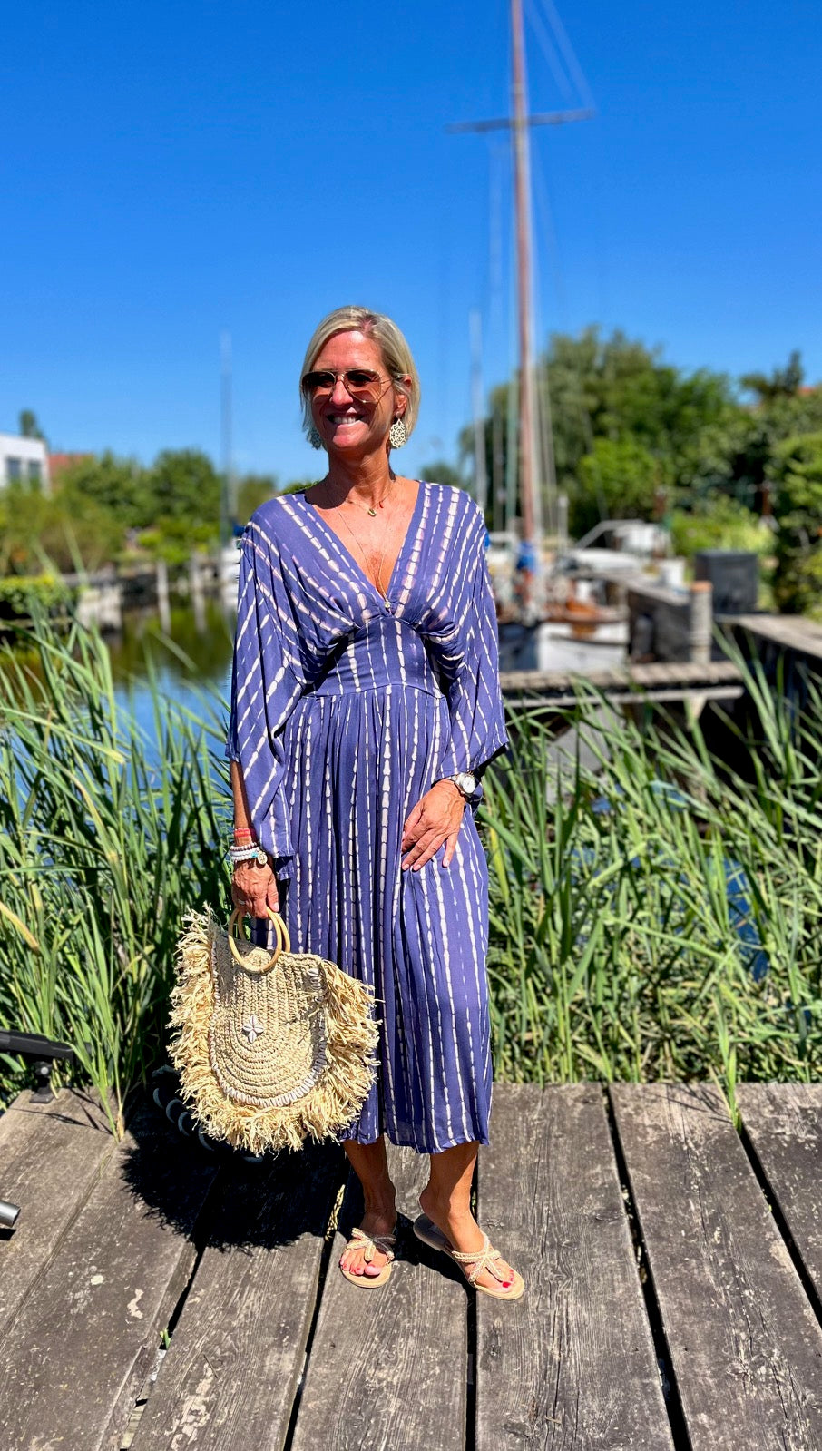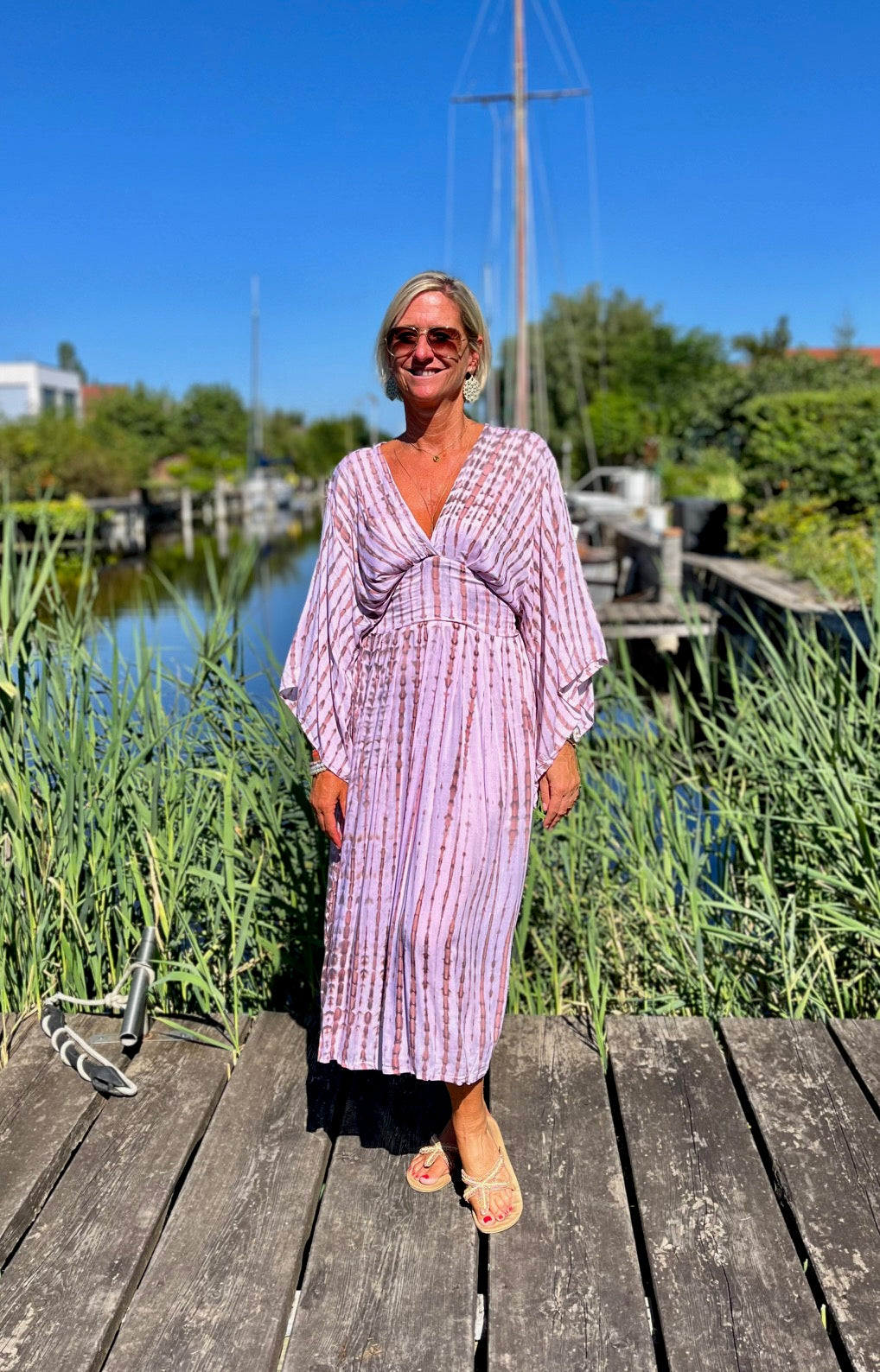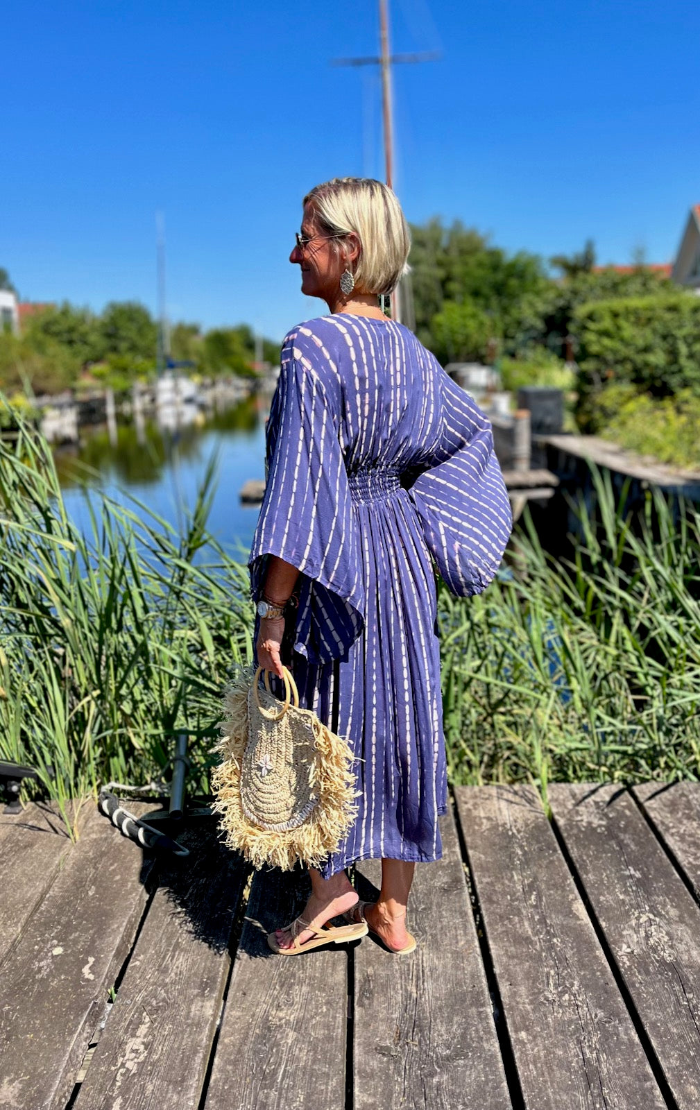 Dieses vielseitige Kaftan Kleid ist ein echter Hingucker und lässt sich mühelos zu verschiedenen Anlässen stylen. Kombiniere es mit deinen Lieblingssandalen und einer großen Sonnenbrille für einen perfekten Beach-Look, oder trage es mit eleganten Accessoires und Wedges für ein Dinner am Meer. Mit dem Alessia Dress bist du immer im Mittelpunkt des Geschehens und genießt dabei unvergleichlichen Komfort.