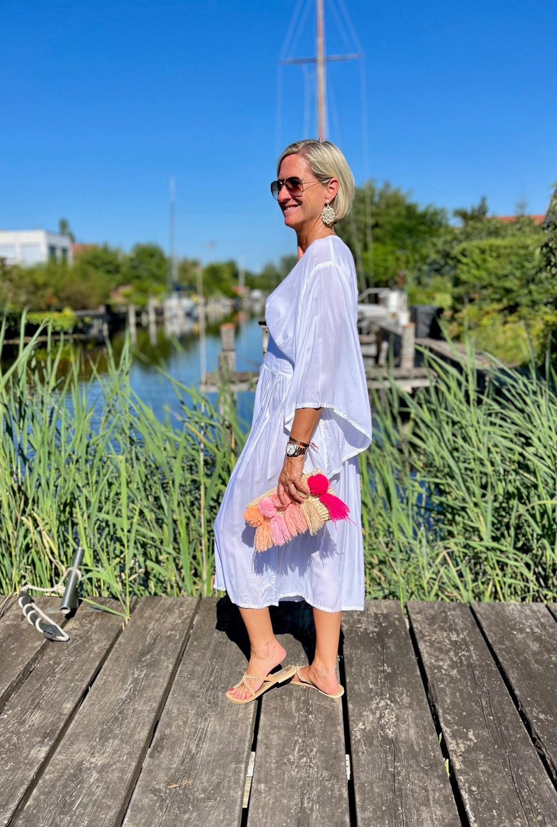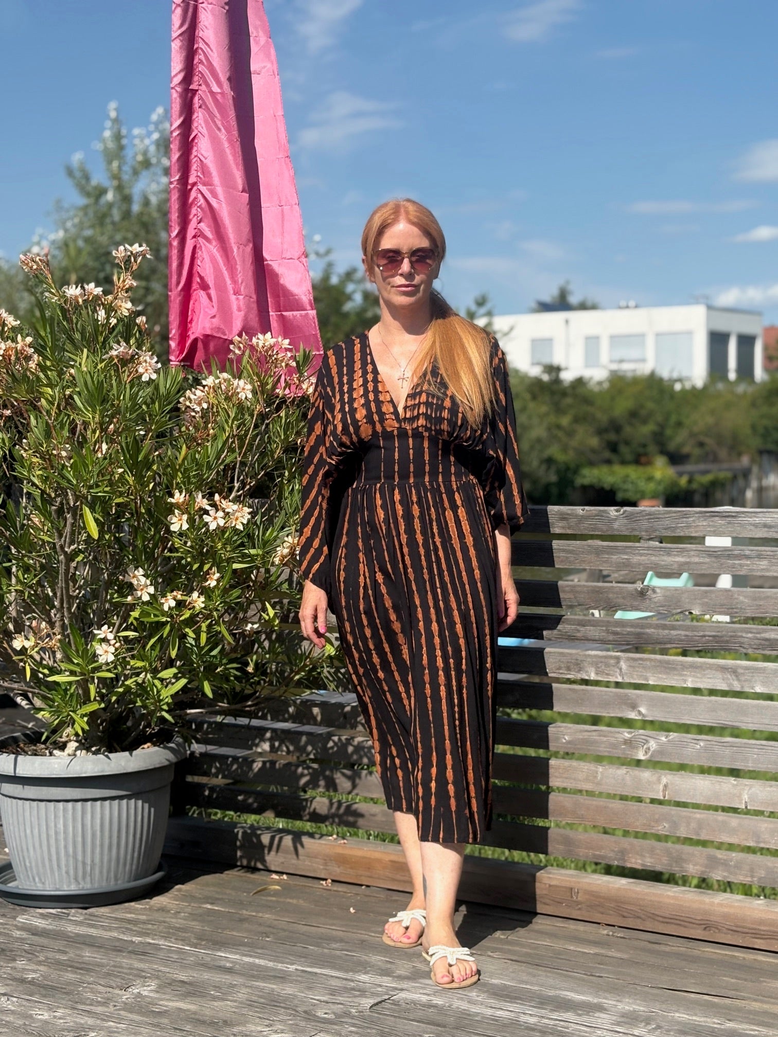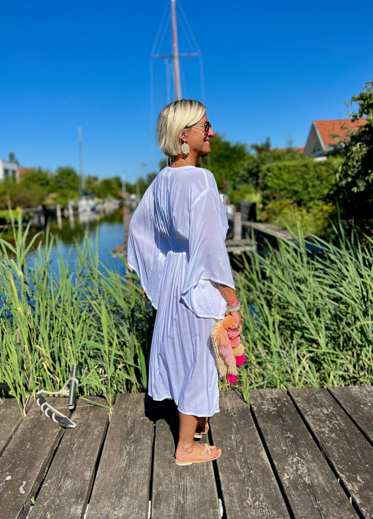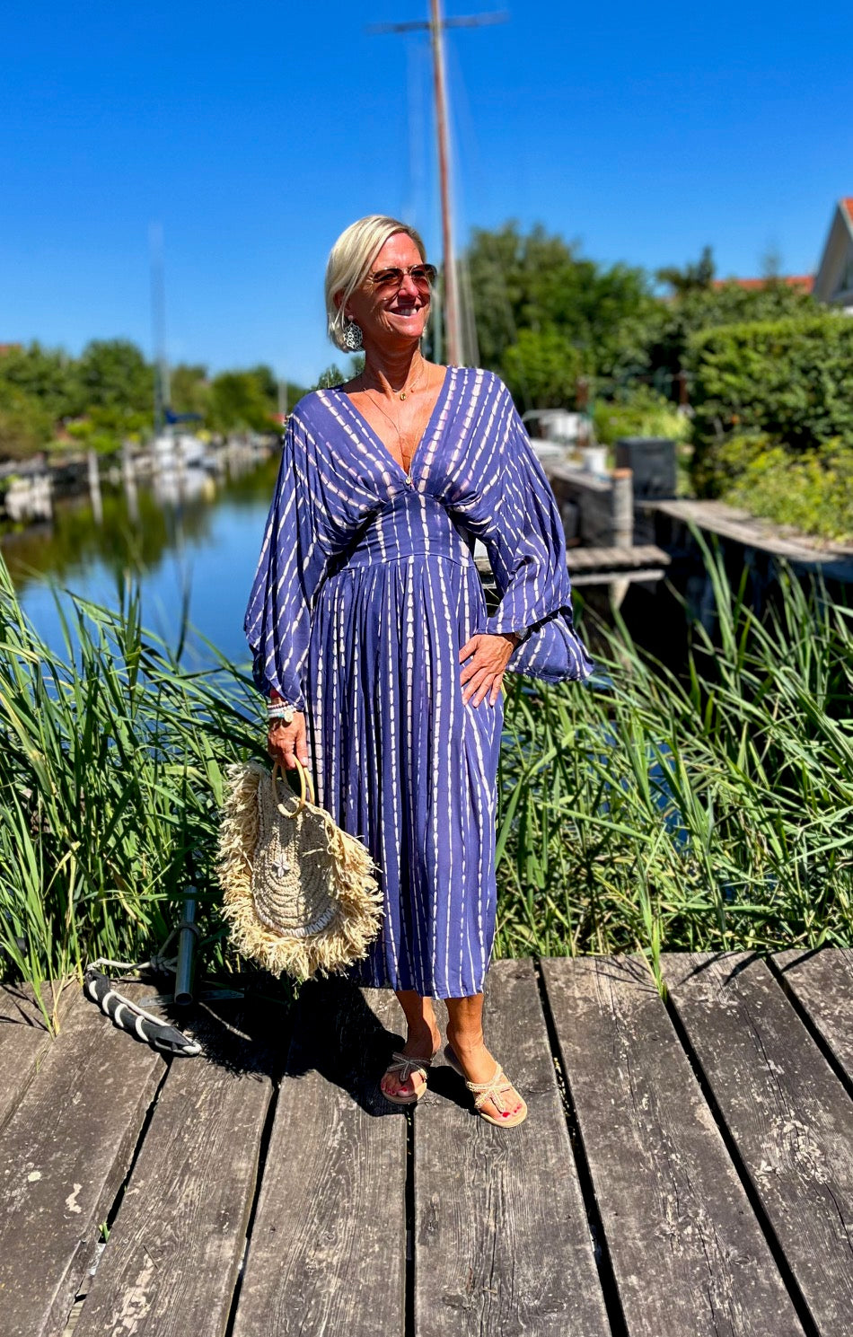 Dieses vielseitige Kaftan Kleid ist ein echter Hingucker und lässt sich mühelos zu verschiedenen Anlässen stylen. Kombiniere es mit deinen Lieblingssandalen und einer großen Sonnenbrille für einen perfekten Beach-Look, oder trage es mit eleganten Accessoires und Wedges für ein Dinner am Meer. Mit dem Alessia Dress bist du immer im Mittelpunkt des Geschehens und genießt dabei unvergleichlichen Komfort.