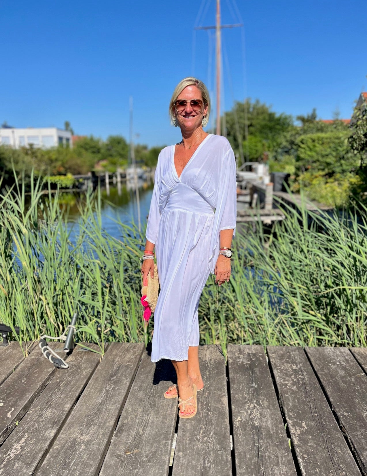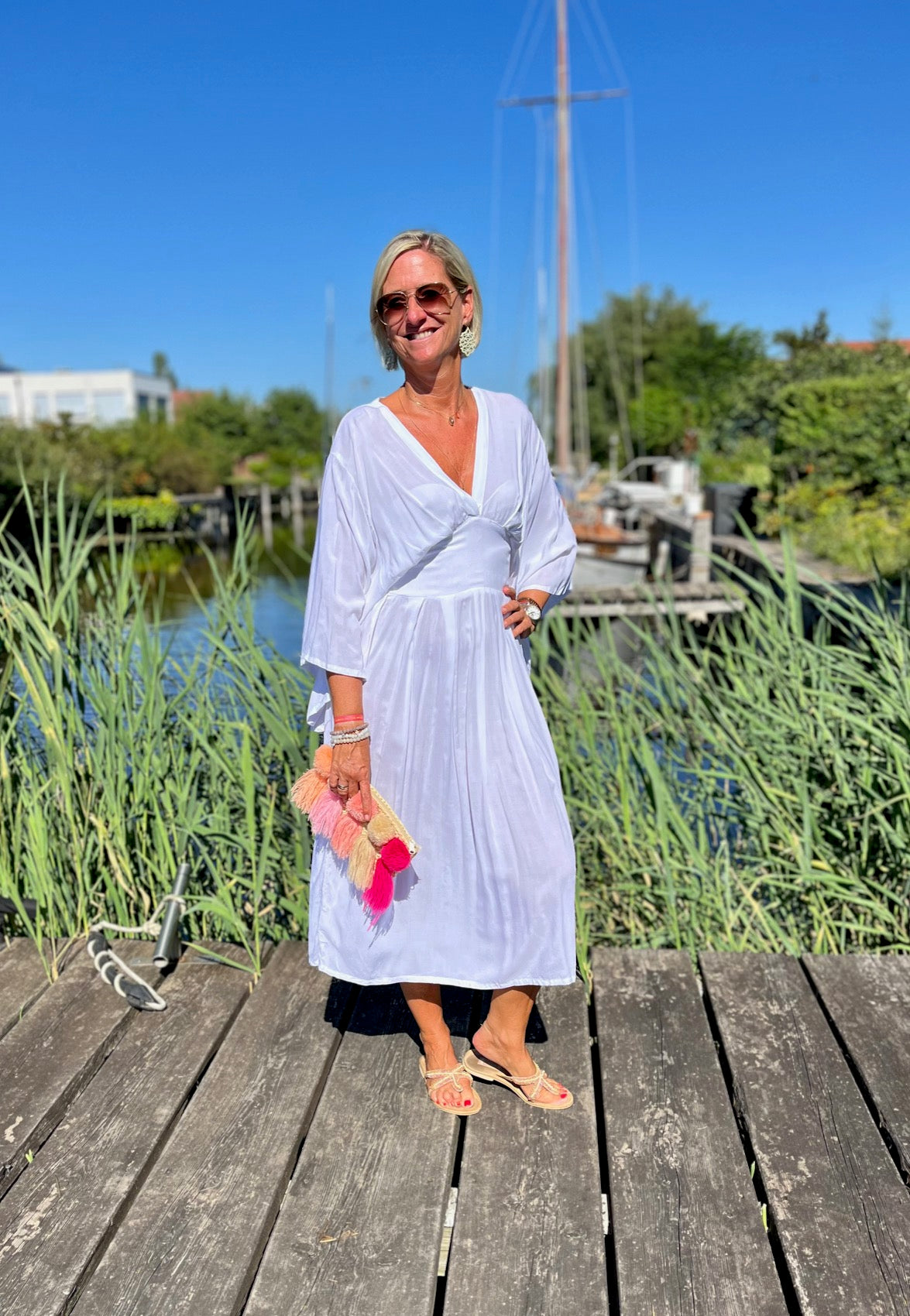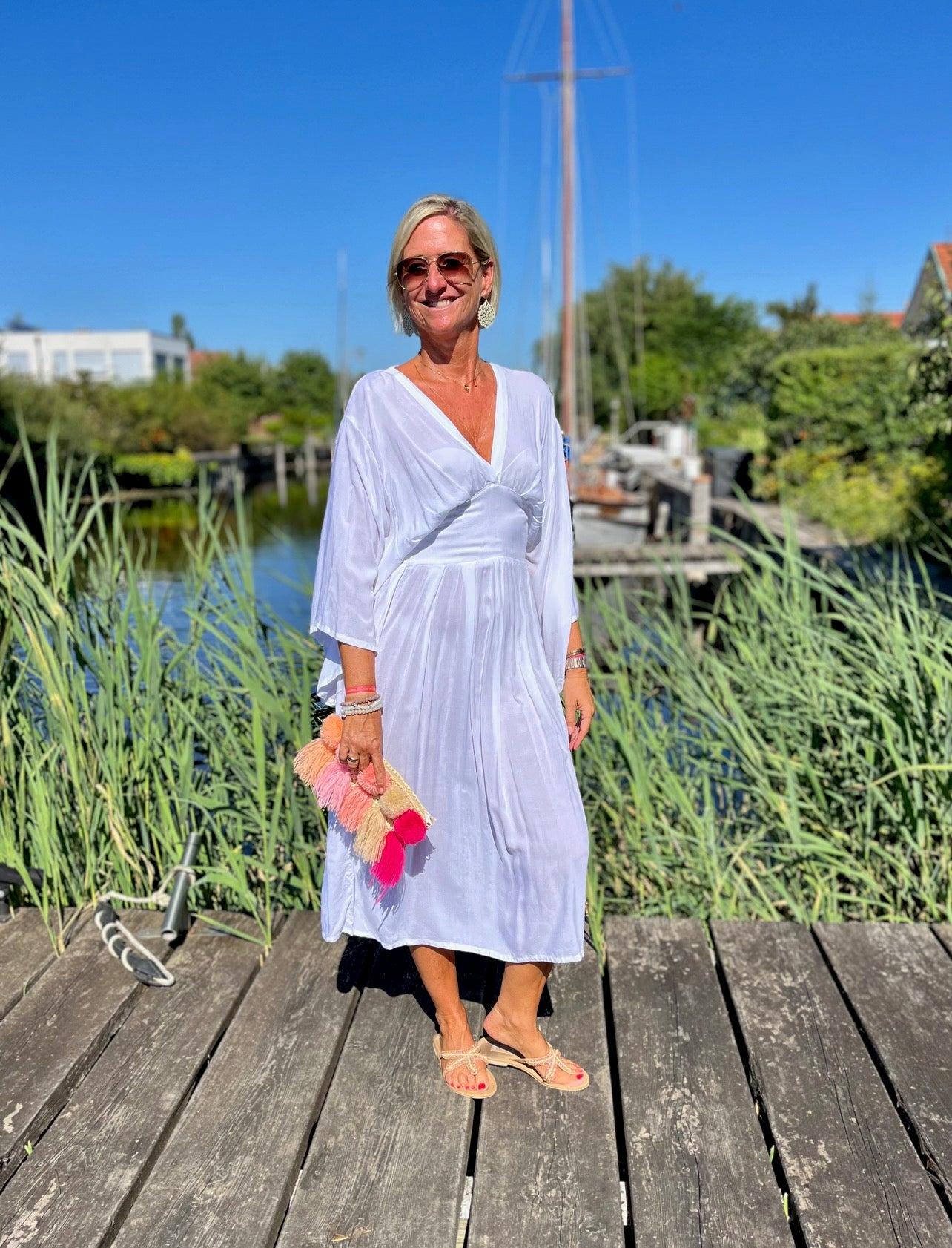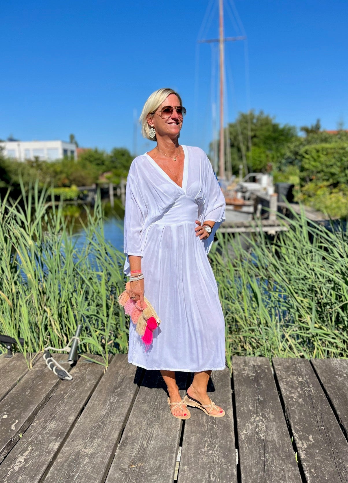 Dieses vielseitige Kaftan Kleid ist ein echter Hingucker und lässt sich mühelos zu verschiedenen Anlässen stylen. Kombiniere es mit deinen Lieblingssandalen und einer großen Sonnenbrille für einen perfekten Beach-Look, oder trage es mit eleganten Accessoires und Wedges für ein Dinner am Meer. Mit dem Alessia Dress bist du immer im Mittelpunkt des Geschehens und genießt dabei unvergleichlichen Komfort.