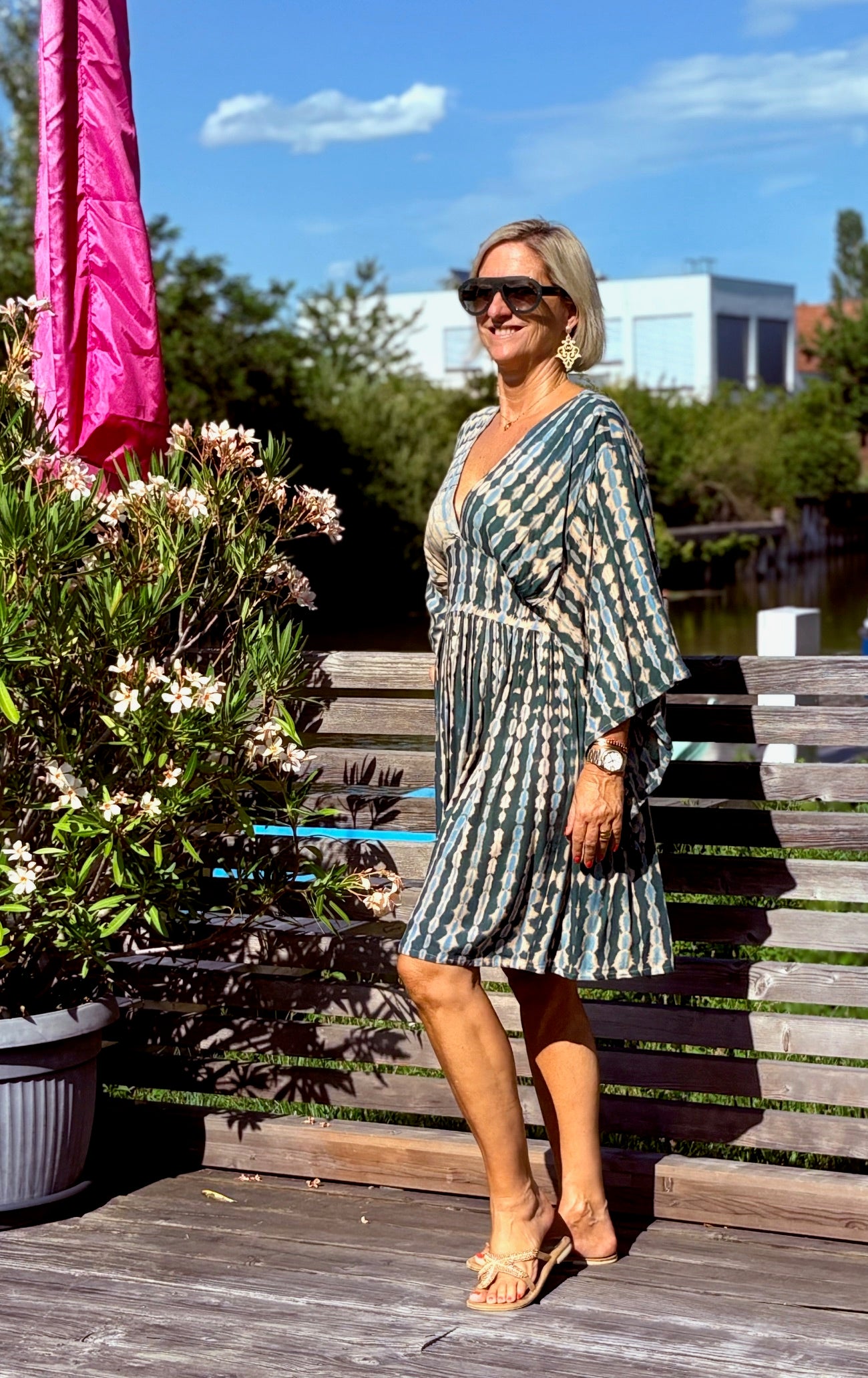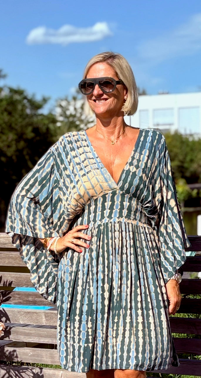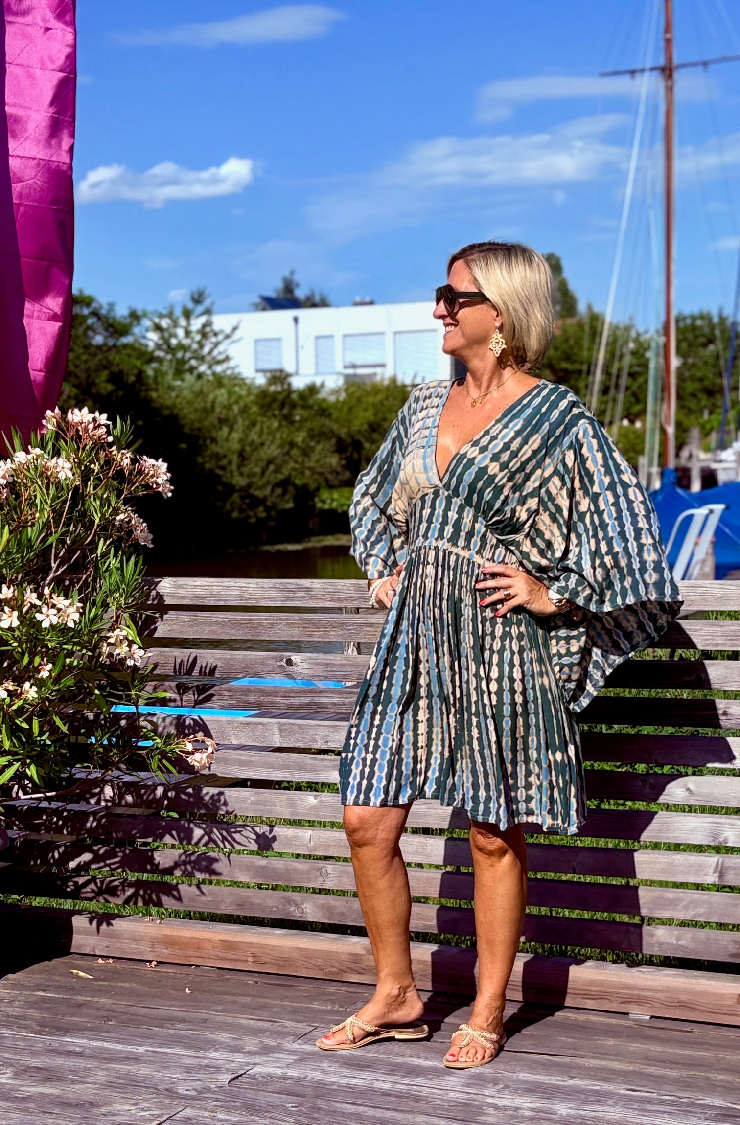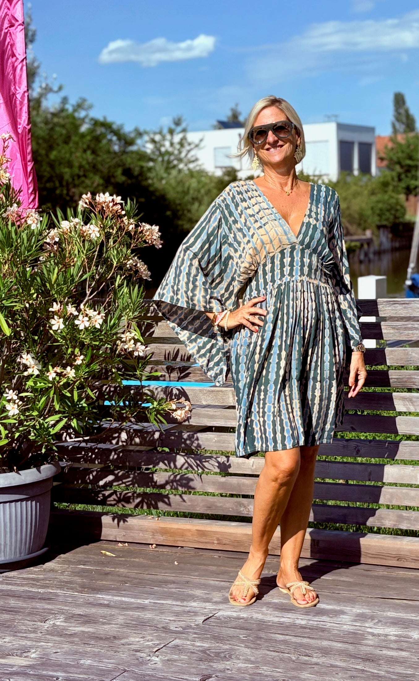 Stell dir vor, du spazierst am Strand entlang, eine sanfte Brise weht durch dein Haar – und dein Kaftan Dress "Alessia" schwingt mühelos mit. Dieses luftige Kaftan Dress, zusammengesetzt aus 100% Viskose, zeichnet sich durch seinen lockeren Schnitt und den eleganten, hohen Taillenbund aus, der jeder Frau eine fantastische Figur verleiht.