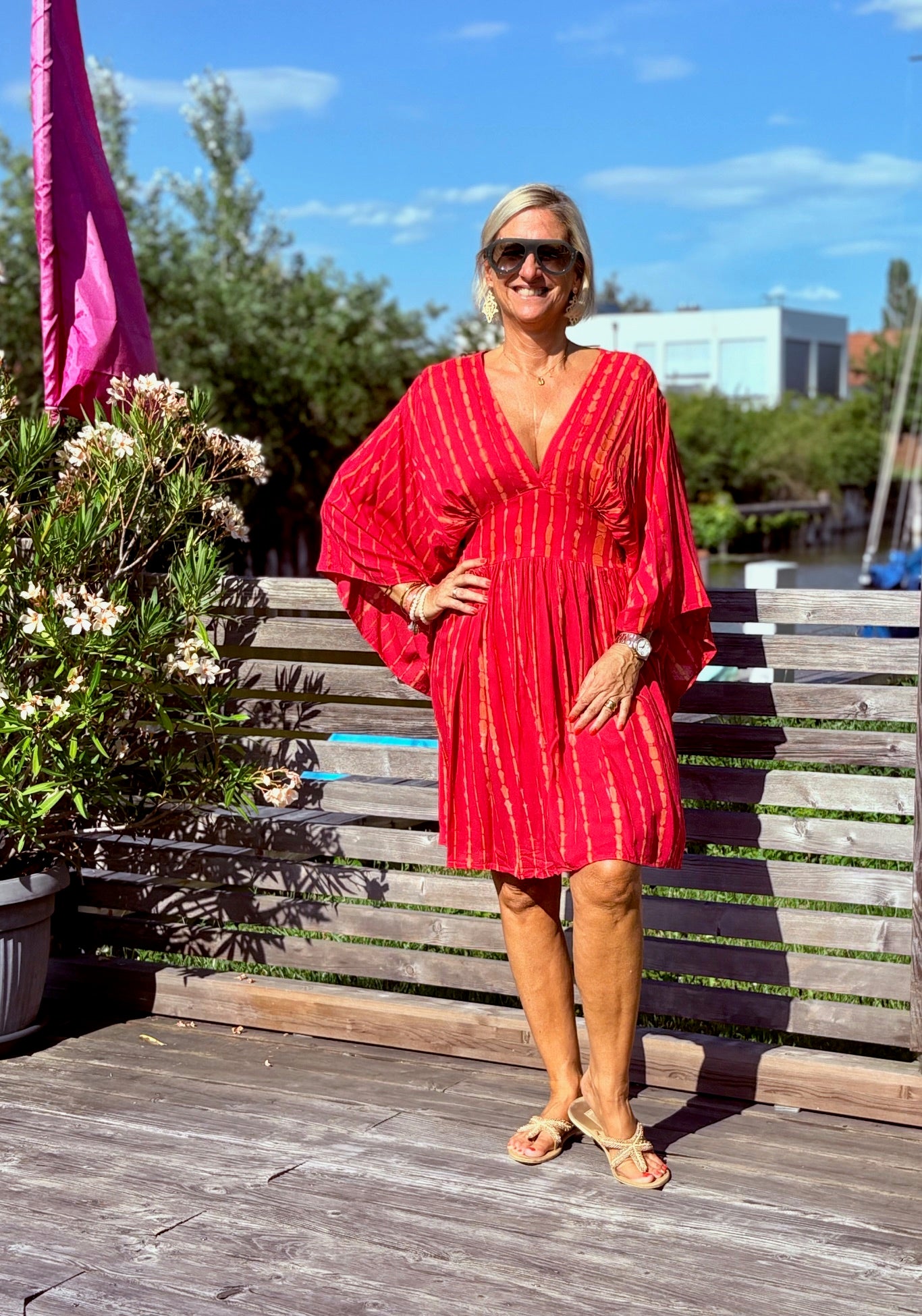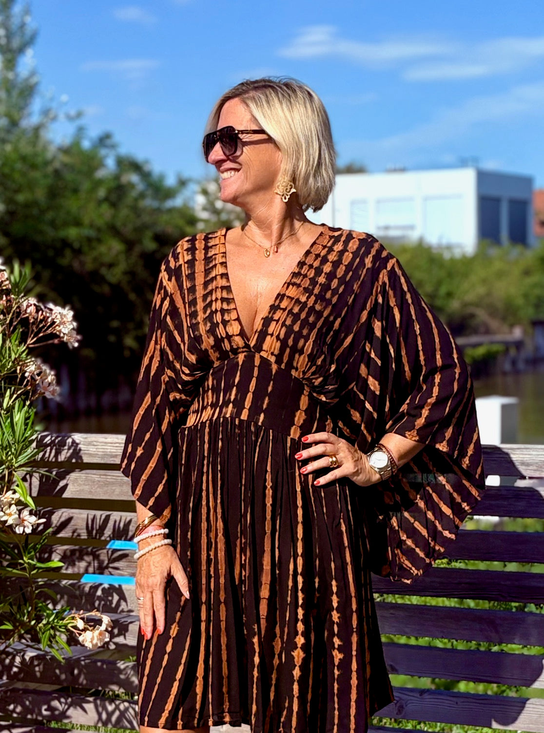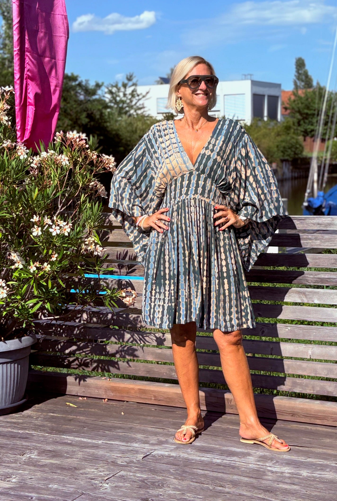 Der tiefe V-Ausschnitt sowie die weiten, offenen Ärmel unterstreichen seine lässige Eleganz und machen ihn zu einem perfekten Begleiter für warme Sommertage. Ob du dich für einen lebhaften Tie Dye Print entscheidest oder einen schlichten Uni-Ton bevorzugst, das "Alessia"-Kaftan bietet stets einen stilvollen Auftritt.