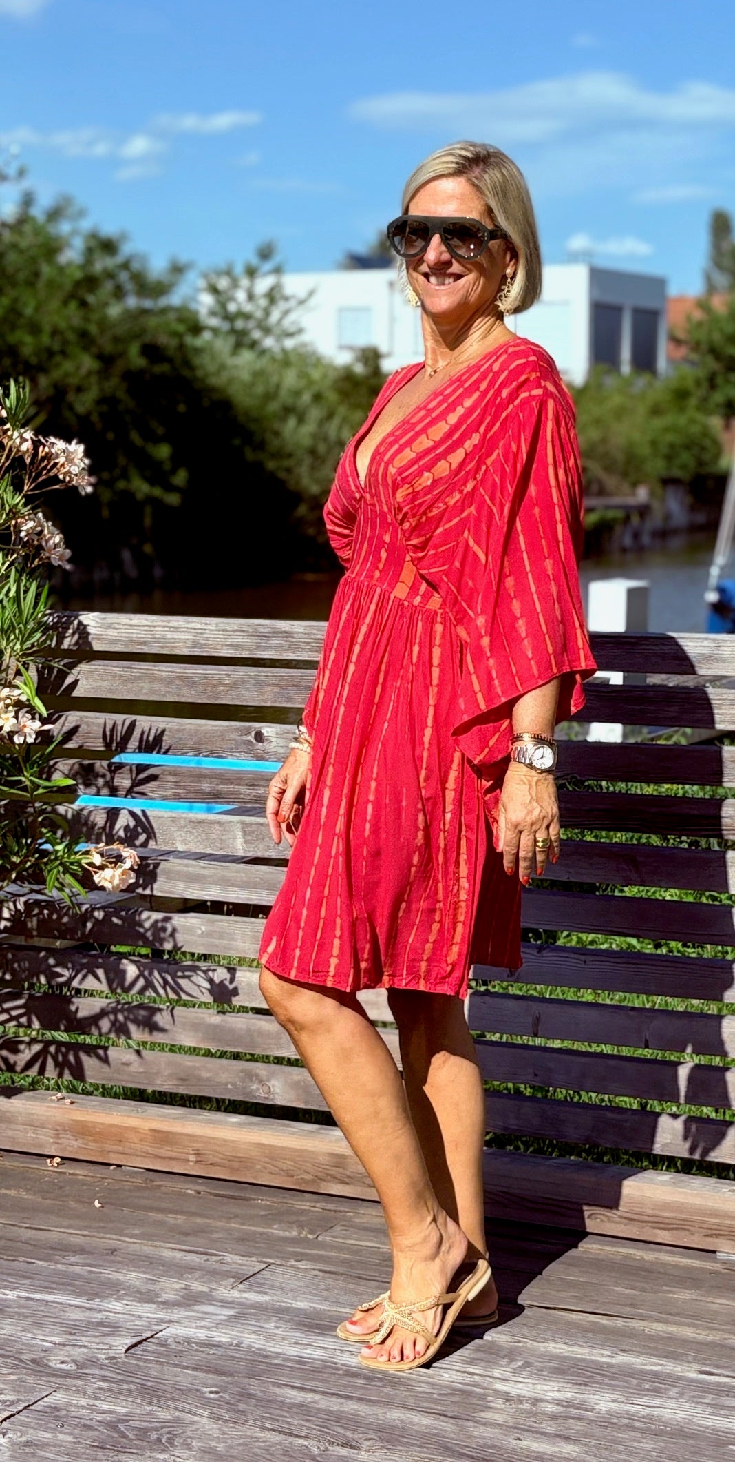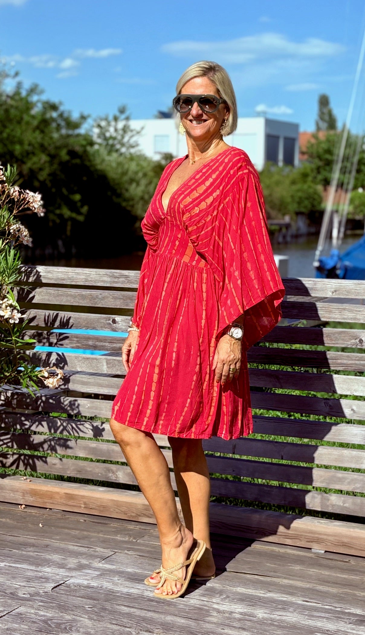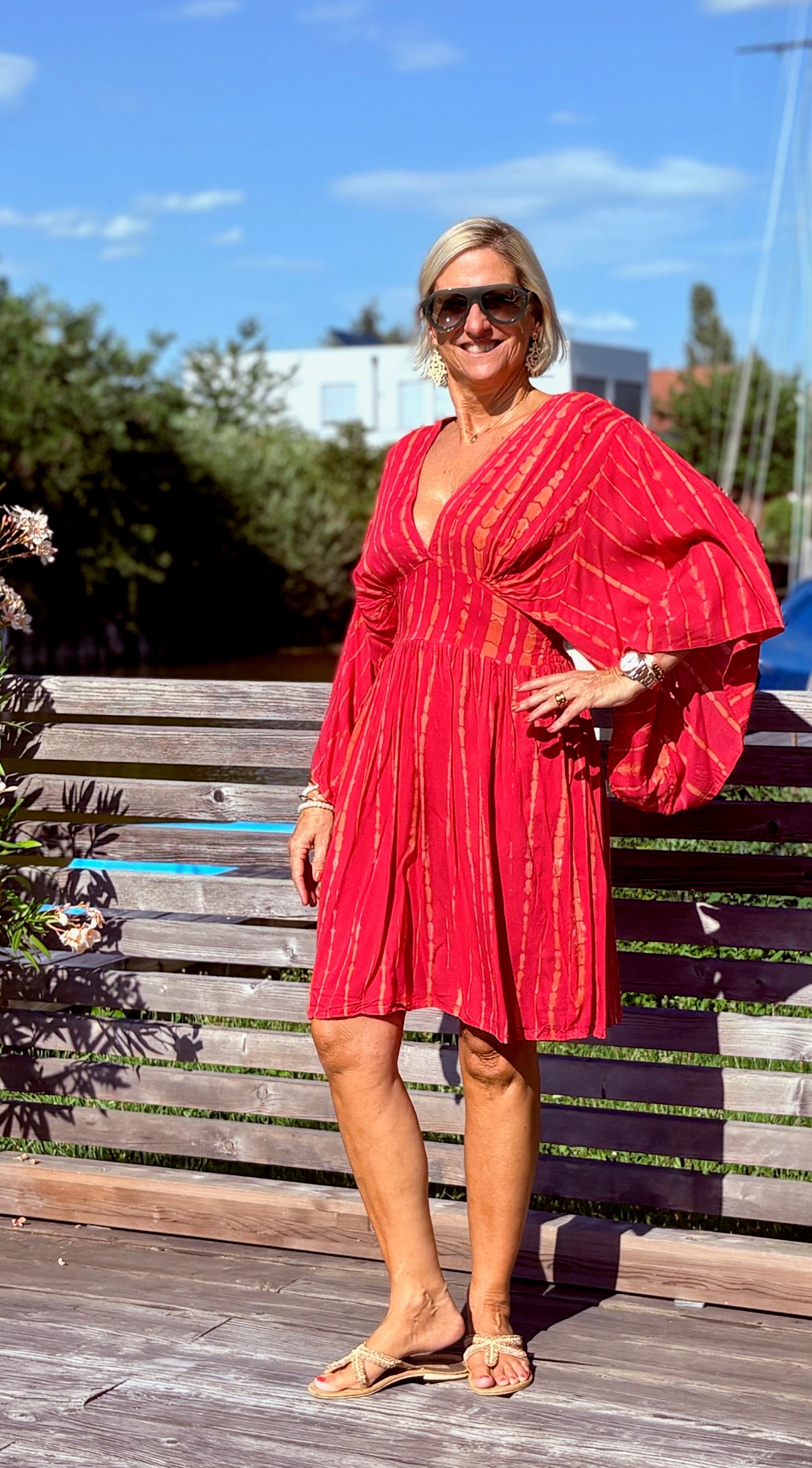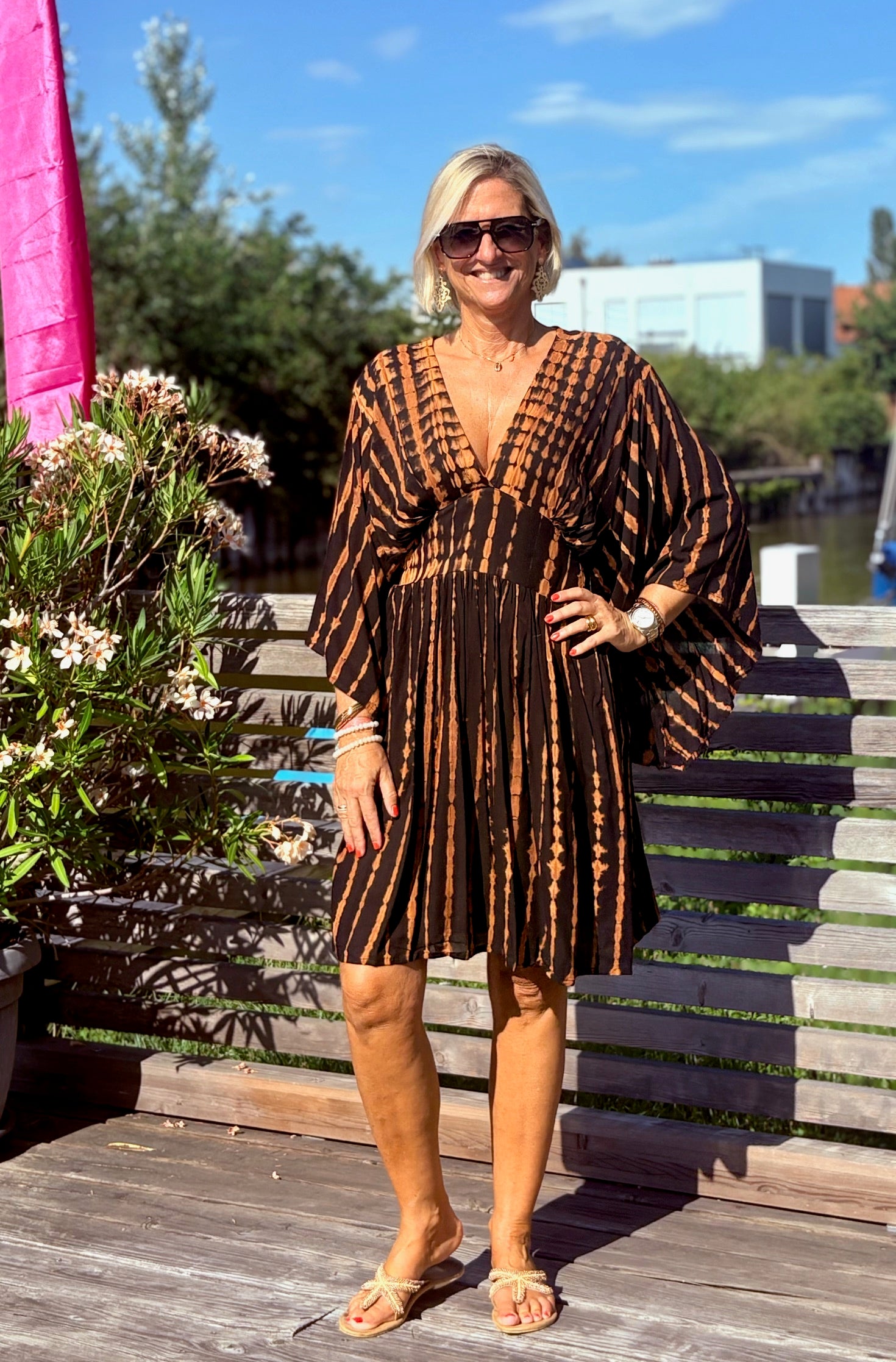Der tiefe V-Ausschnitt sowie die weiten, offenen Ärmel unterstreichen seine lässige Eleganz und machen ihn zu einem perfekten Begleiter für warme Sommertage. Ob du dich für einen lebhaften Tie Dye Print entscheidest oder einen schlichten Uni-Ton bevorzugst, das "Alessia"-Kaftan bietet stets einen stilvollen Auftritt.