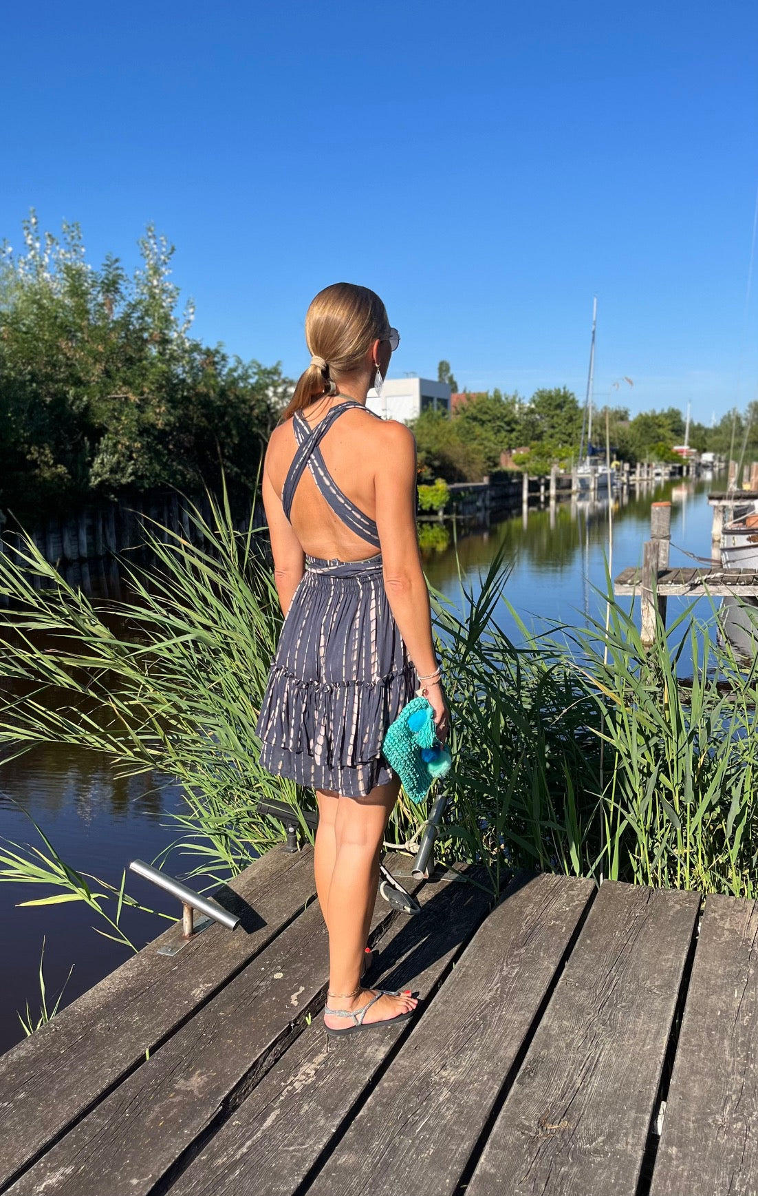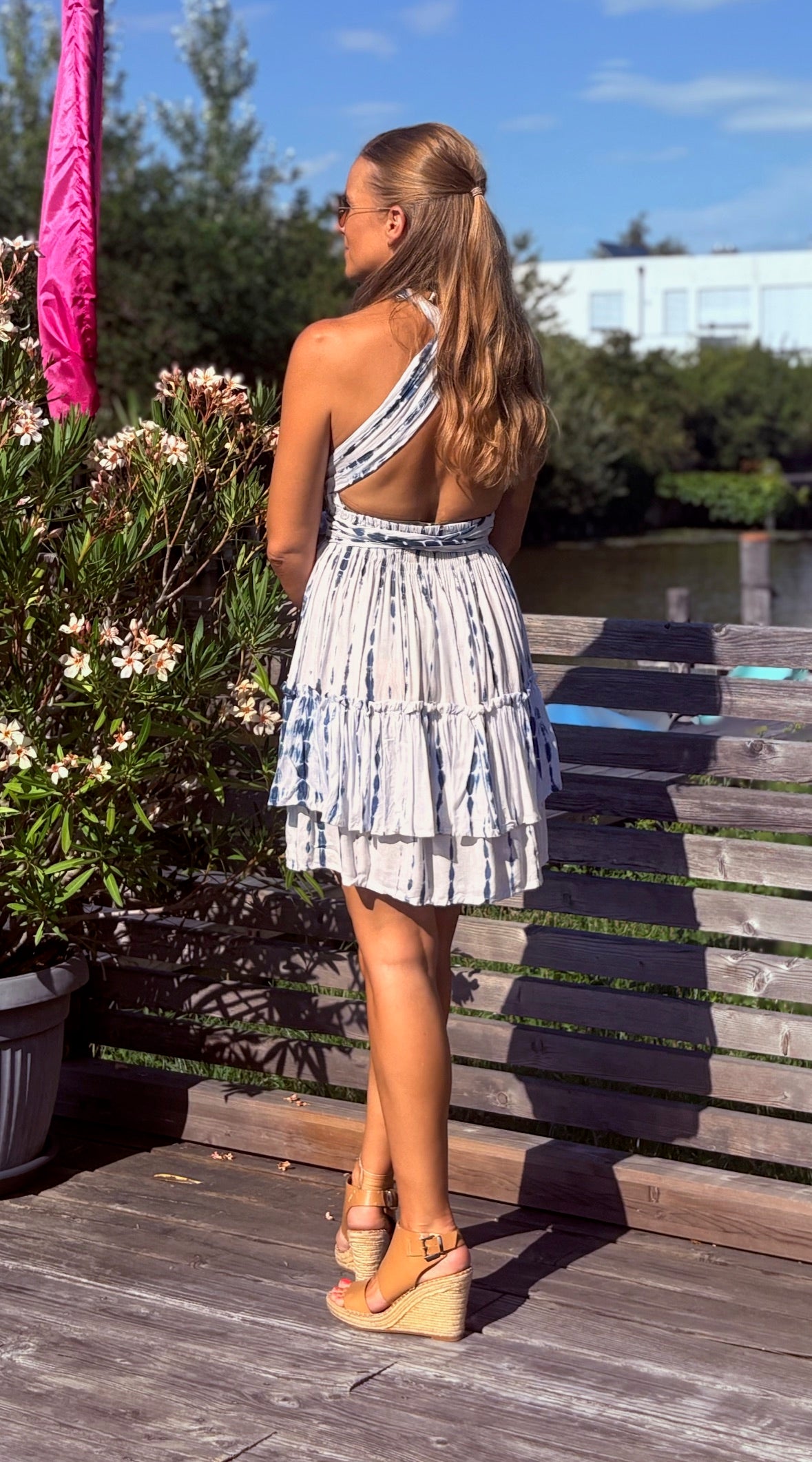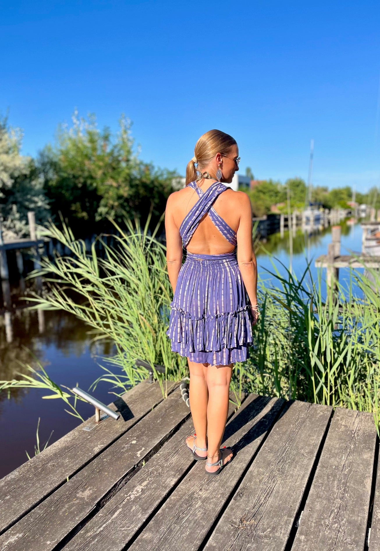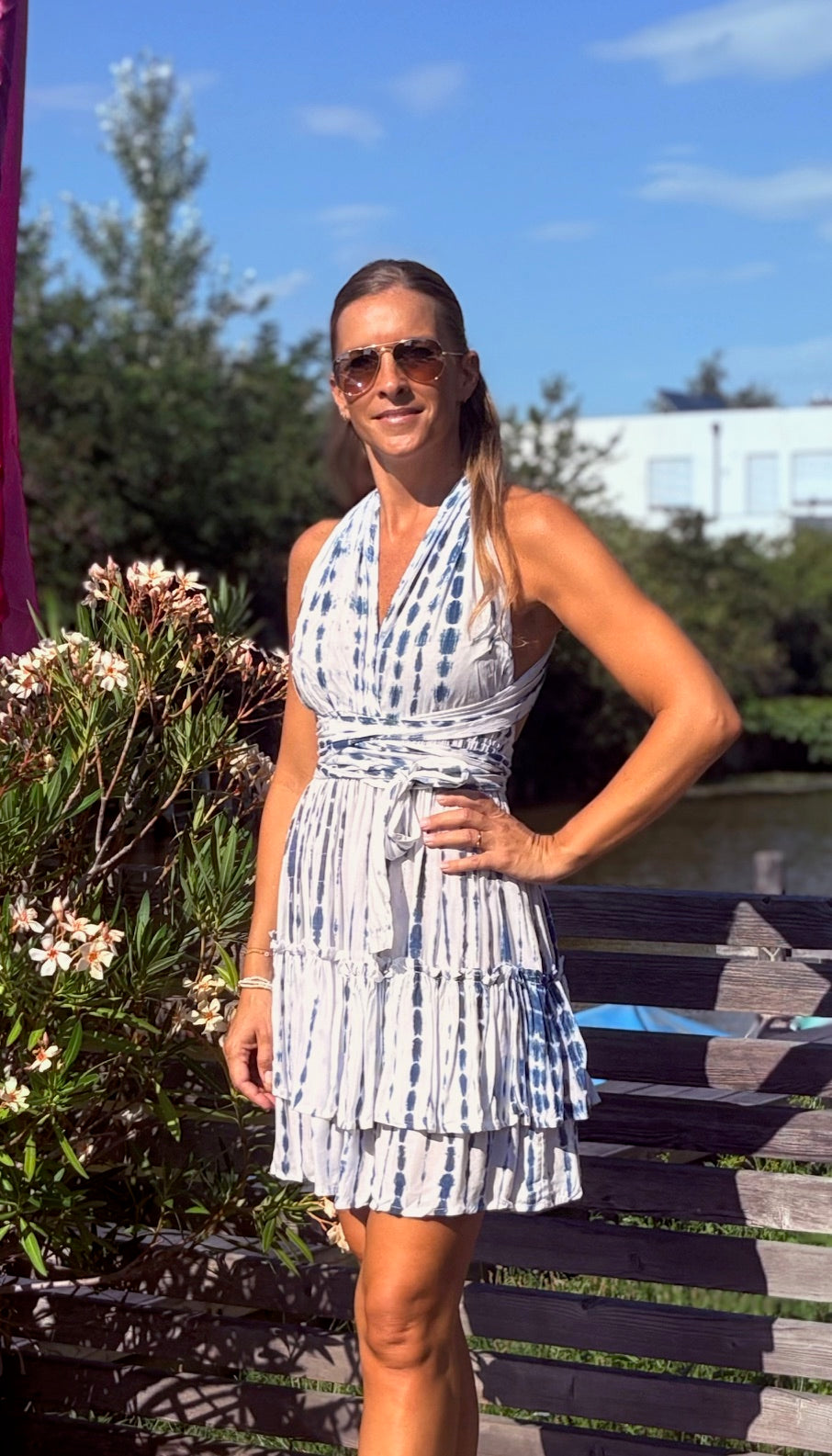 Das Design des Kleides begeistert mit femininen Volants und einem modischen Tie Dye Print, der jedem Outfit eine entspannte, boho-inspirierte Note verleiht. Mit den breiten Bändern lässt sich das "Alicia"-Kleid auf verschiedene Arten tragen – als Neckholder oder überkreuzt am Rücken – für immer wieder frische Looks, die garantiert zum Blickfang werden. Dank der One Size Passform schmeichelt es verschiedenen Körpertypen und sorgt für großartigen Komfort.