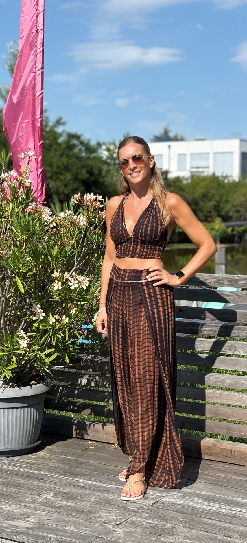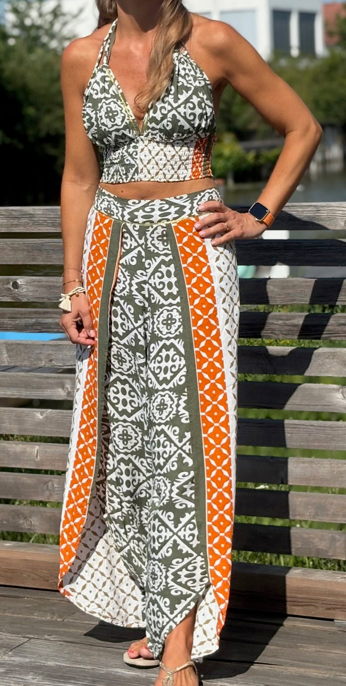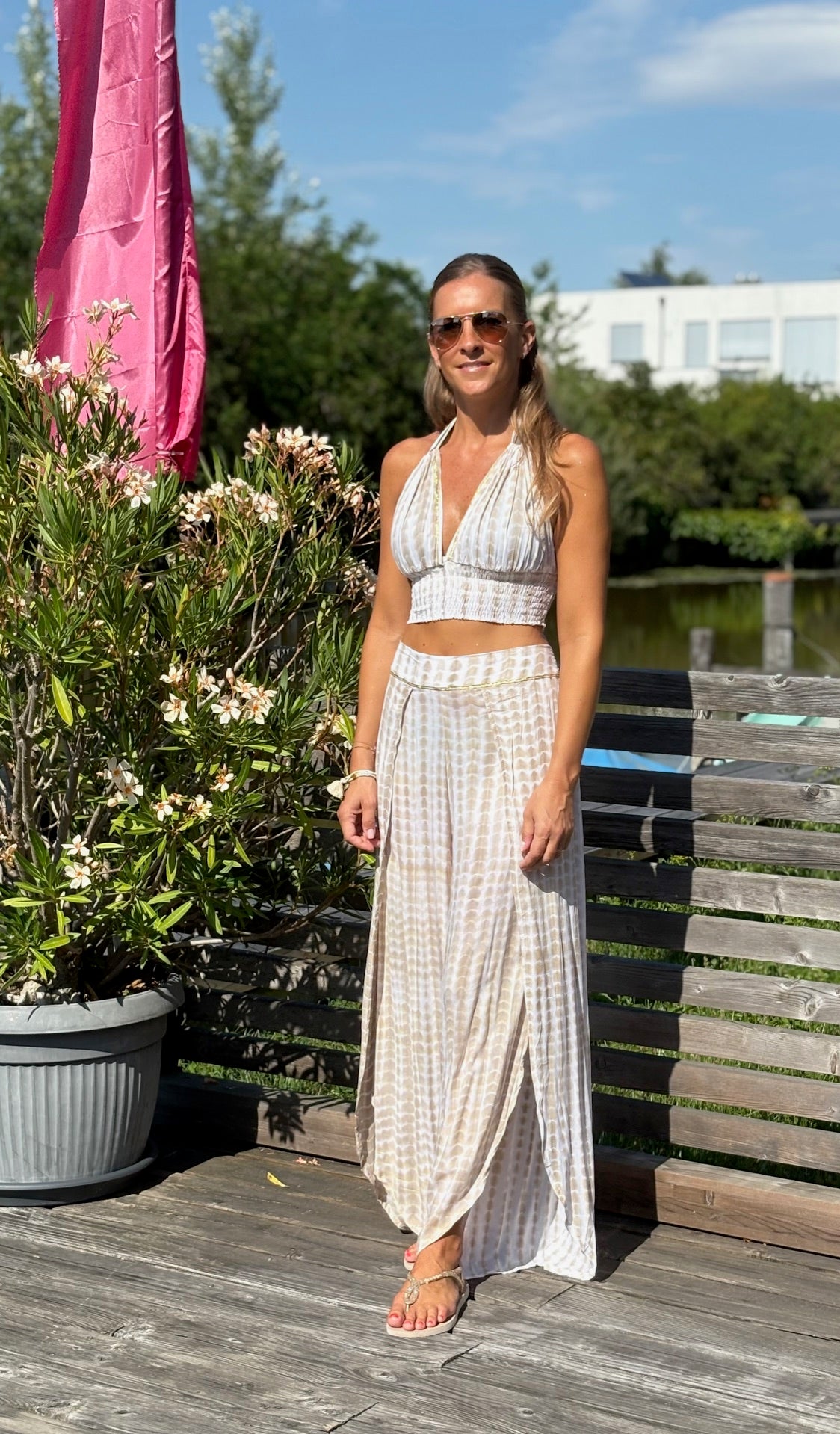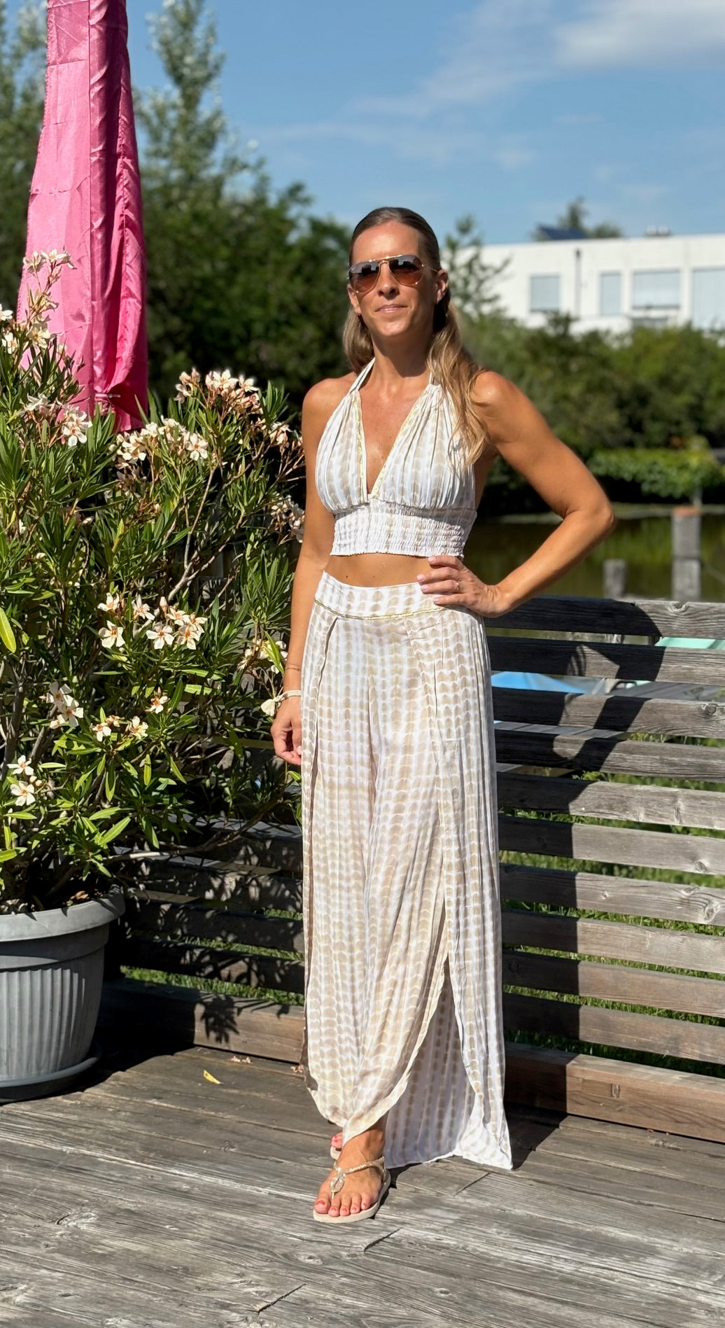 Besonders hervorzuheben ist die lässige, aber dennoch stilvolle Passform, die in einer universellen One Size erhältlich ist. Die Hose besticht durch ihre seitlichen Schlitze, die nicht nur für eine zusätzliche Brise sorgen, sondern auch einen Hauch von Eleganz verleihen. Der breite elastische Bund garantiert einen optimalen Sitz und unterstreicht zugleich die lässige Silhouette der Hose. Das Neckholder Top ergänzt das Set perfekt und verleiht Dir einen femininen Look.